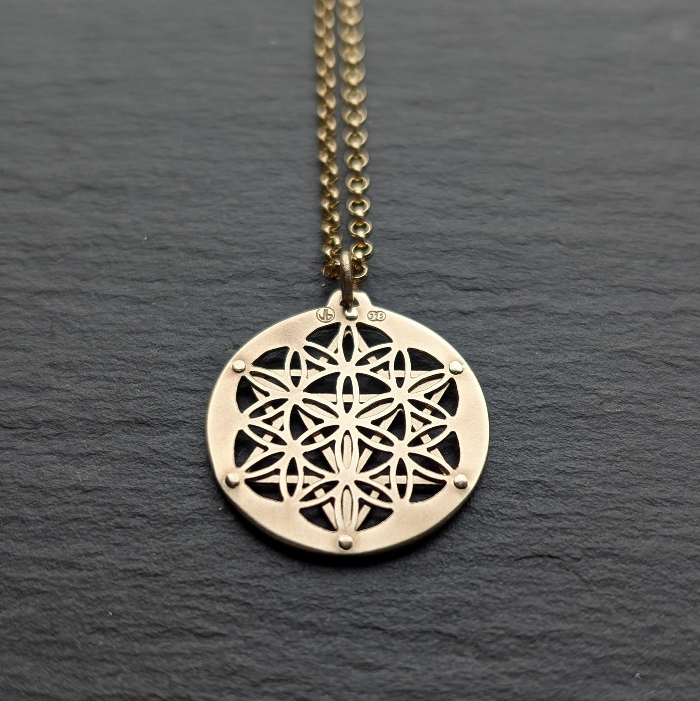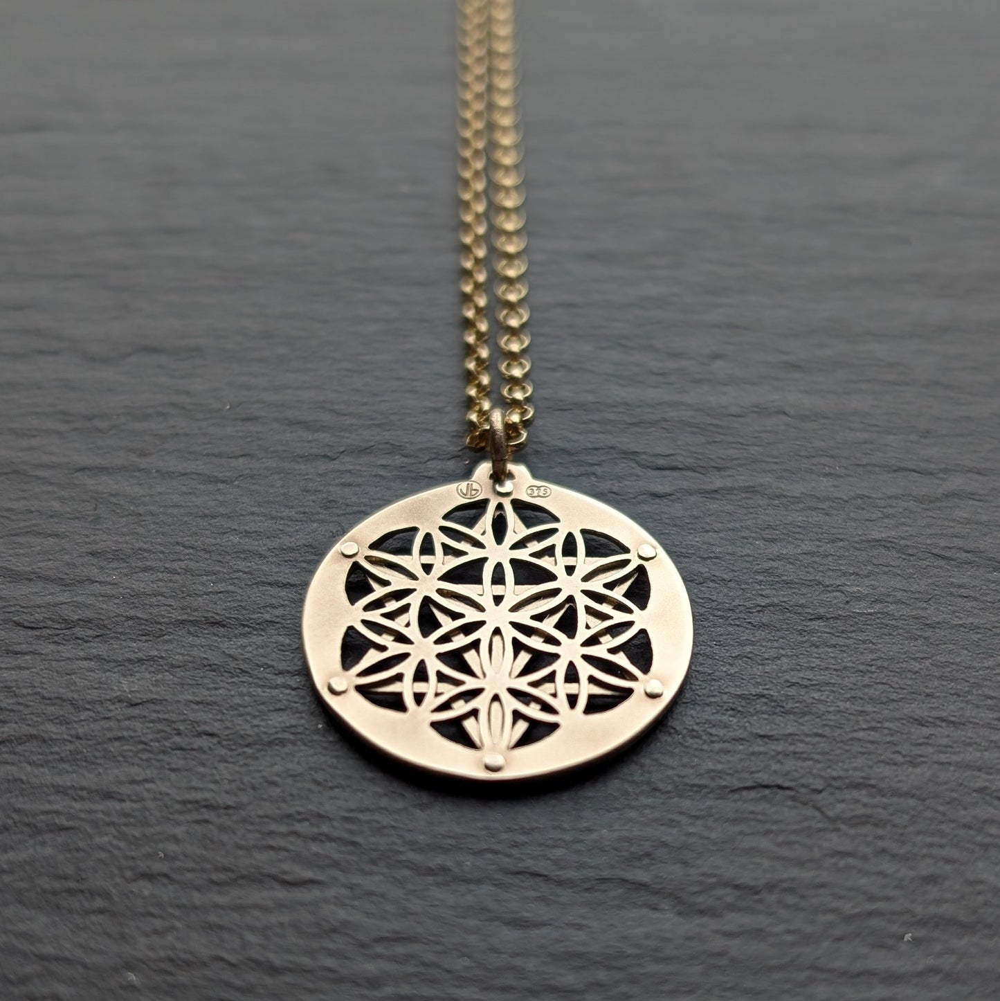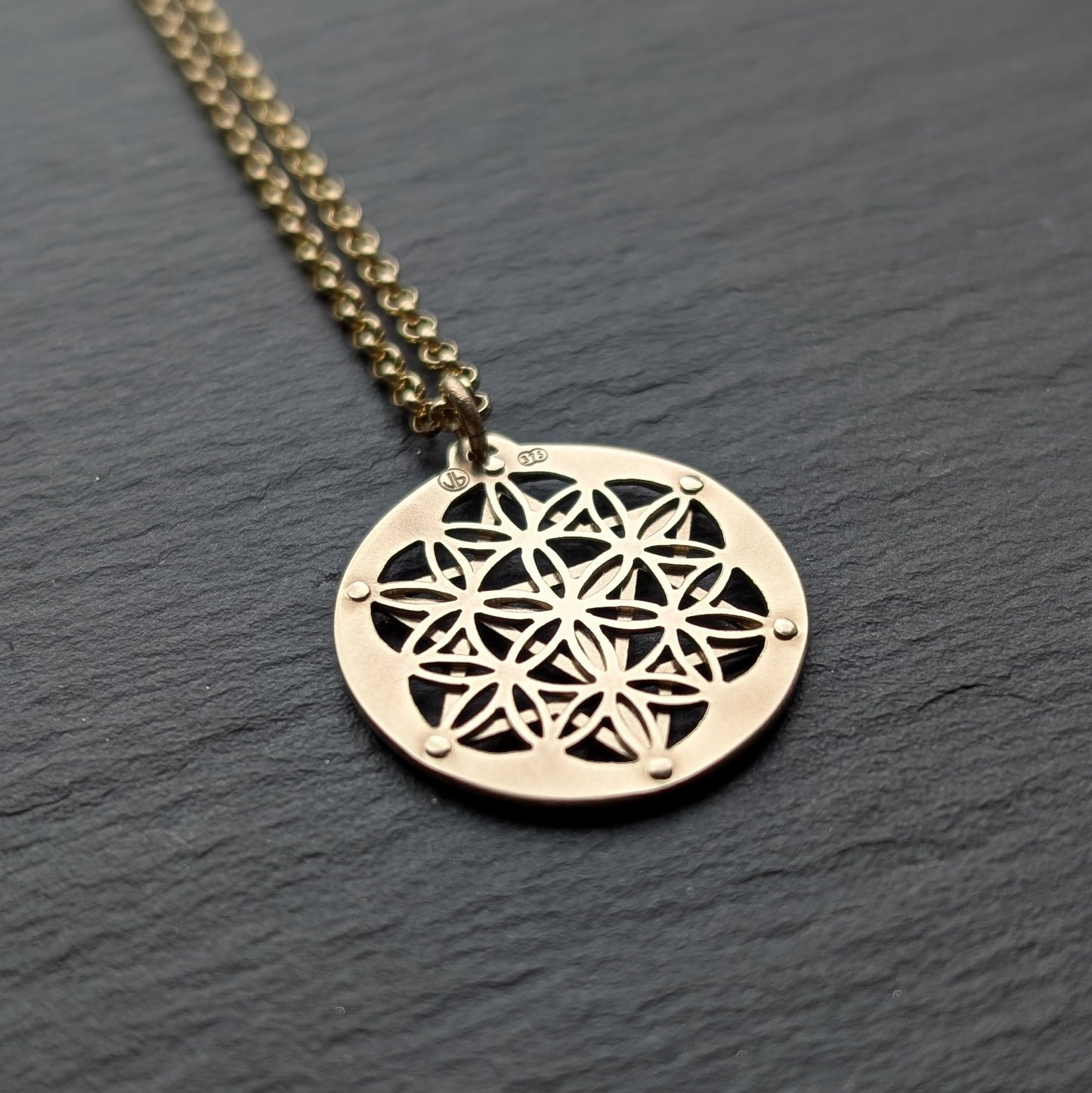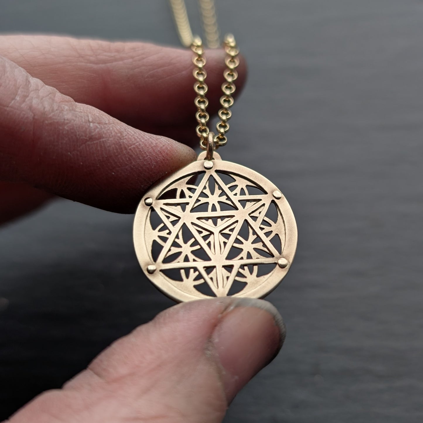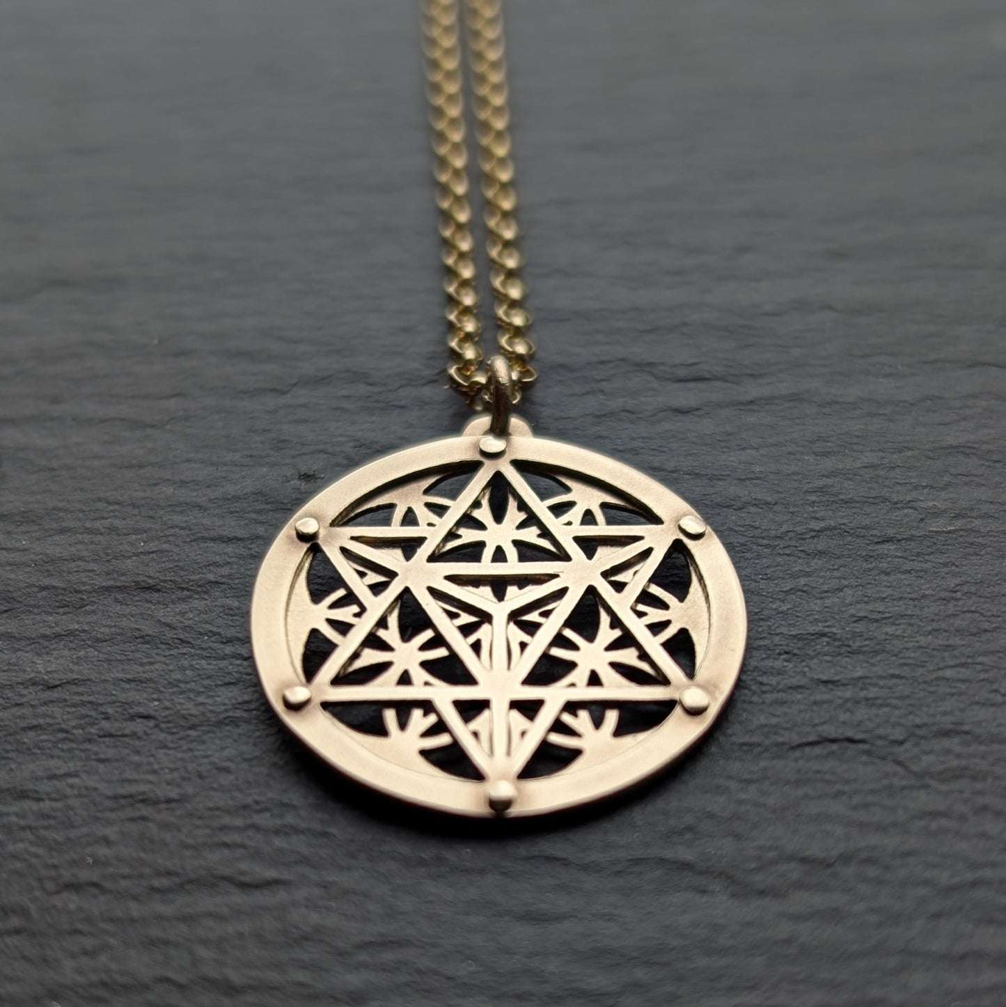 This pendant combines the Star Tetrahedron and the Flower of Life, symbols found in sacred geometry. The Star Tetrahedron (also known as the Merkaba) represents balance and unity, while the Flower of Life is a symbol of creation, mathematically reflecting the patterns of existence itself. Together, they form a visual expression of harmony, energy, and interconnectedness.