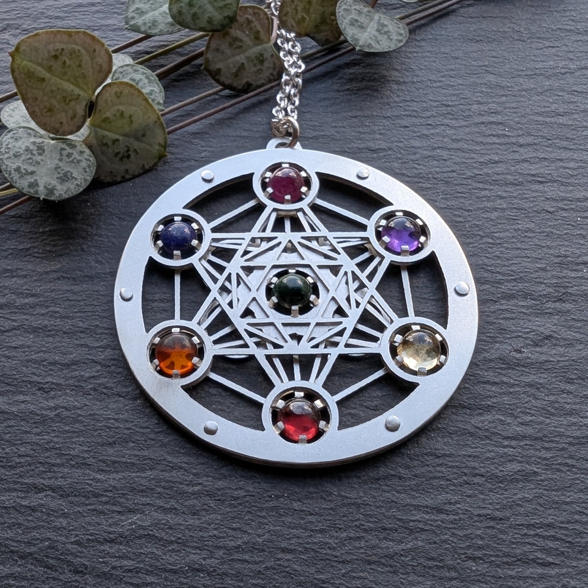 I handcut three layers of sterling silver so that when put together, they form the Metatron's Cube. I cut them by hand using a tiny sawblade, and riveted them together with sterling silver rivets.