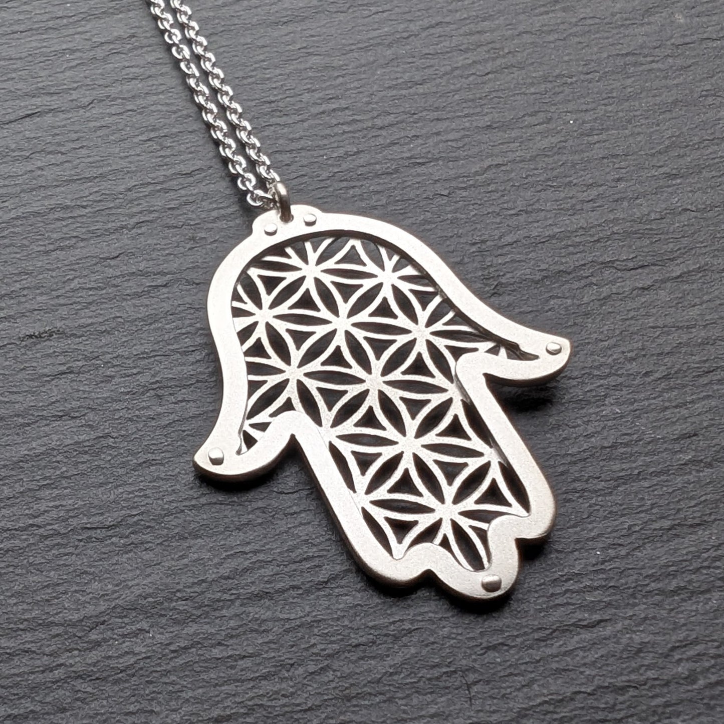 The Hamsa hand is an ancient amulet design for protection. The Flower of Life is a symbol of creation, mathematically reflecting the patterns of existence itself. This design contains ancient, theological value depicting the fundamental forms of space and time, the ultimate representation of creation, harmony, and interconnectedness of all life.
