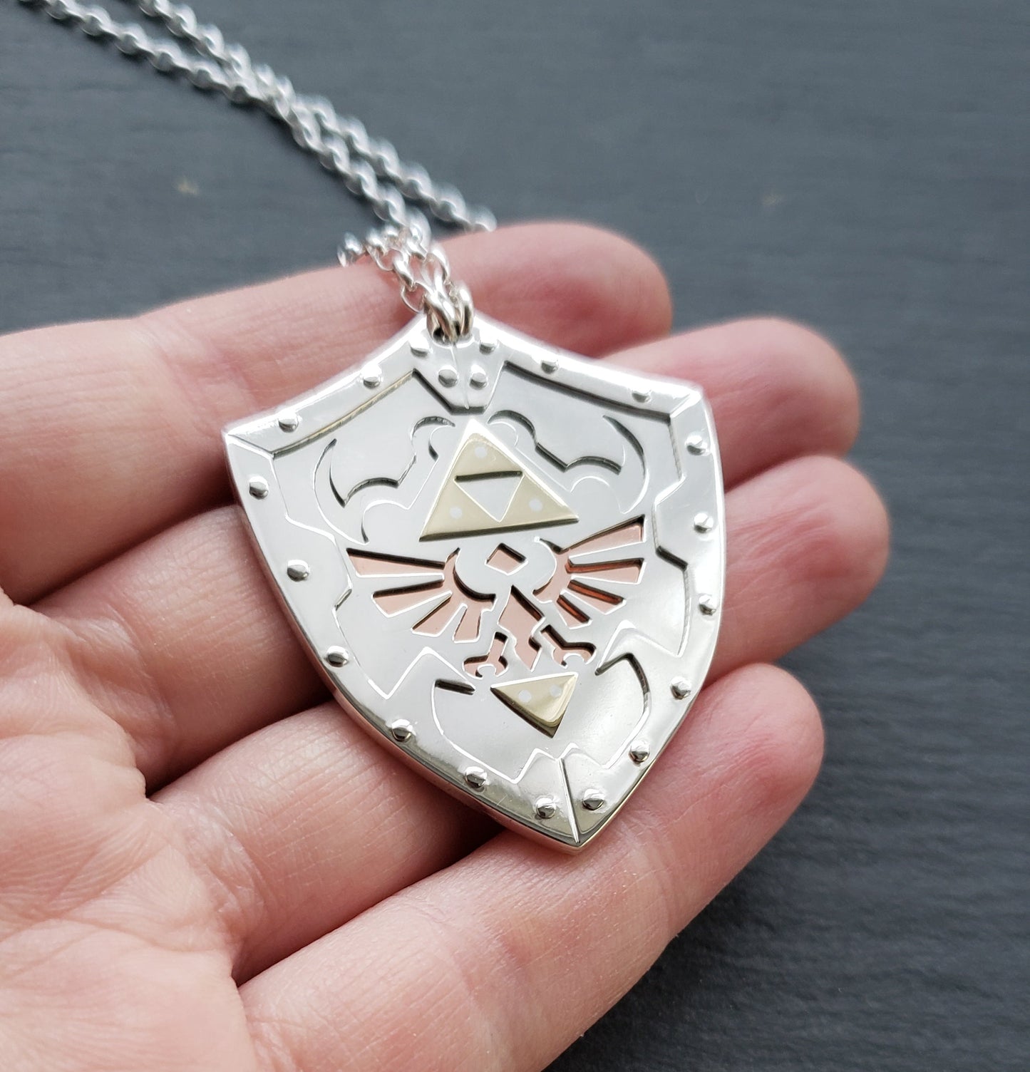 Adorned with the gold triforce representing the virtues of Power, Wisdom and Courage. Beneath it is the copper Hylian Crest of the Crimson Loftwing that aided Link in the founding of Hyrule.