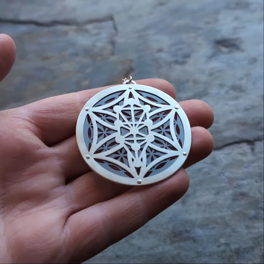 This pendant combines the Flower of Life and the Kabbalah design, also known as the Qabala, Sephiroth and Tree of Life. The Flower of Life is a symbol of creation, mathematically reflecting the patterns of existence itself. This design contains ancient, theological value depicting the fundamental forms of space and time, the ultimate representation of creation, harmony, and interconnectedness of all life.