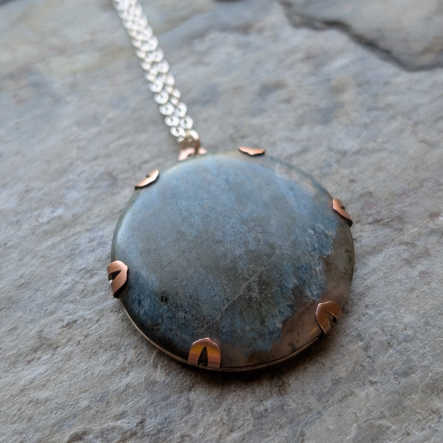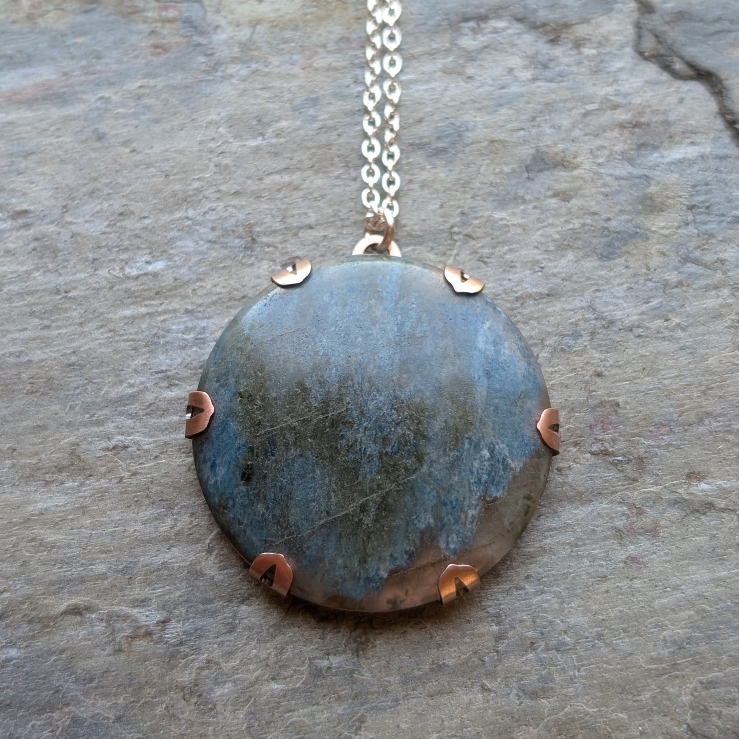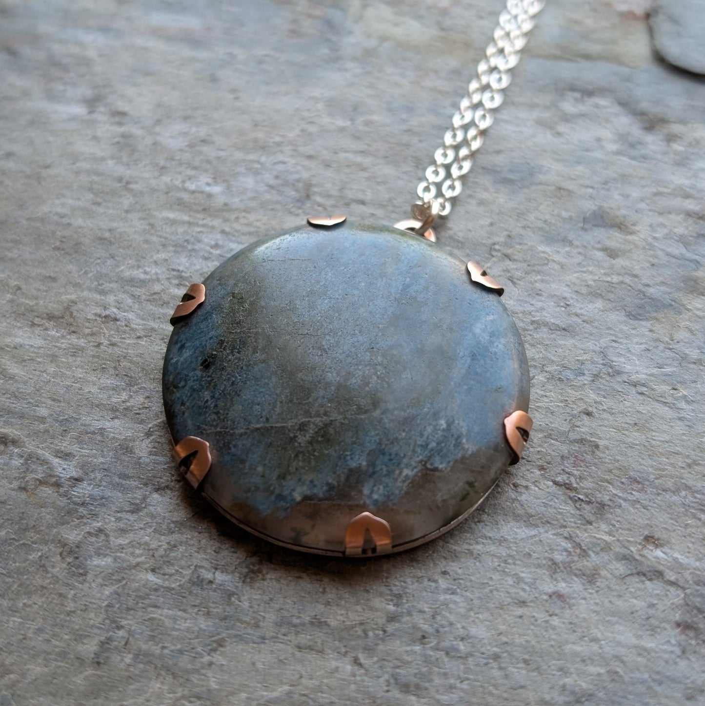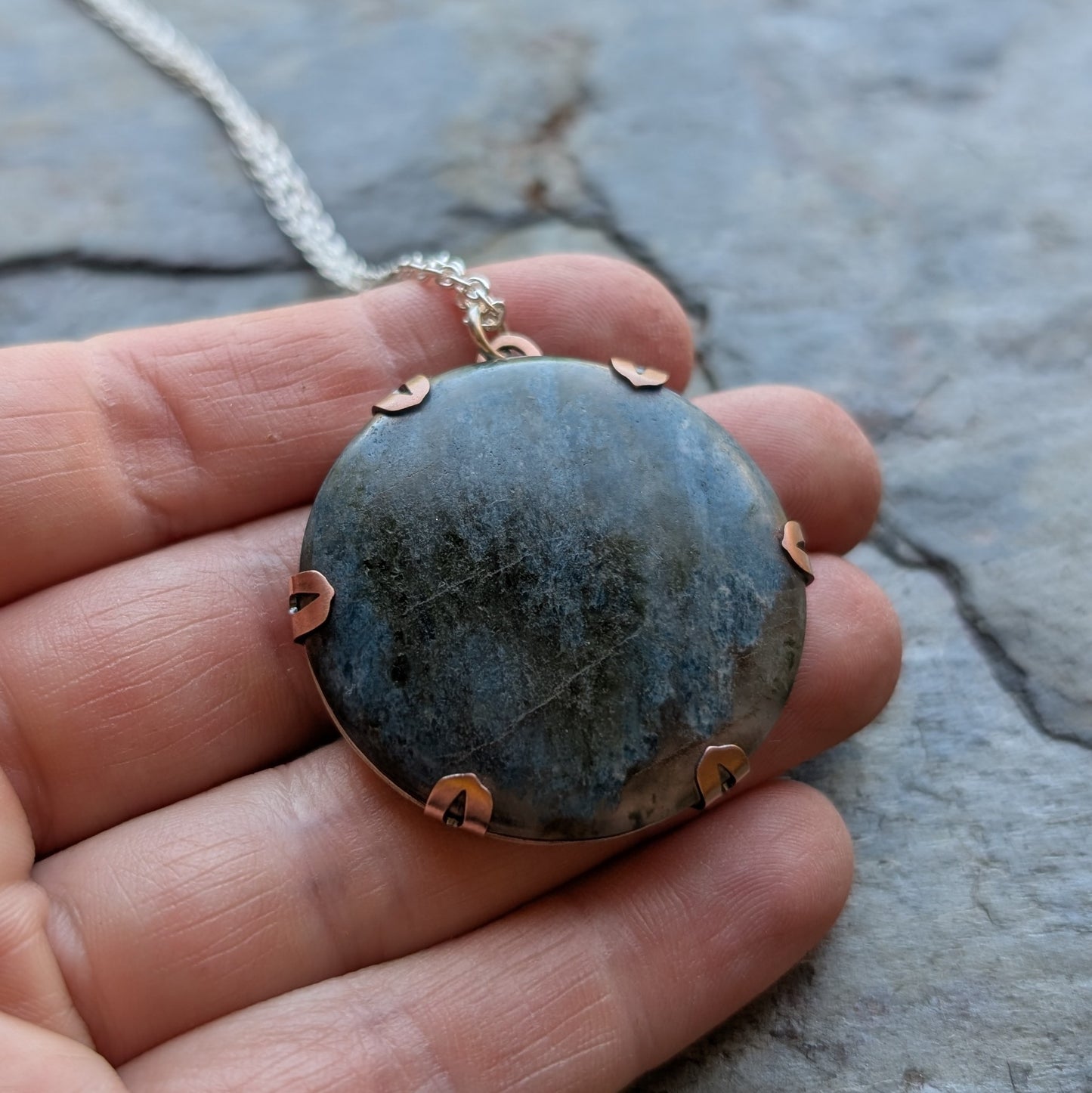 - Material: handcut sterling silver, oxidised copper and Aotea cabochon