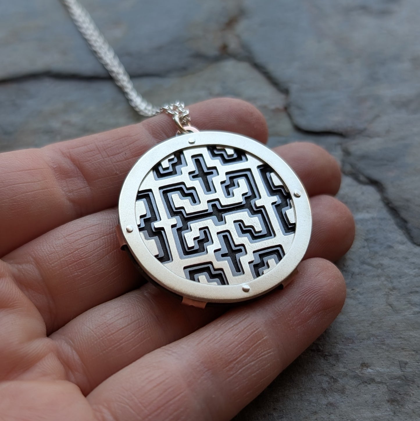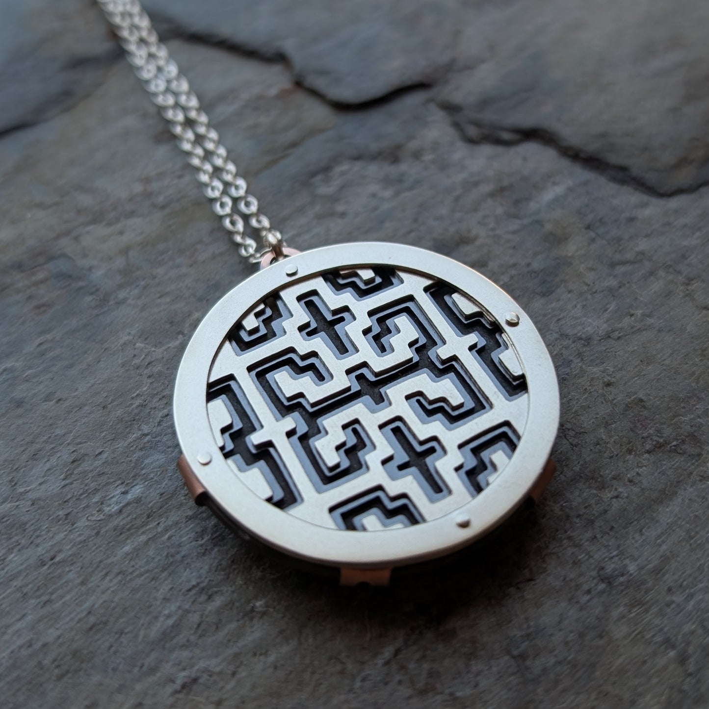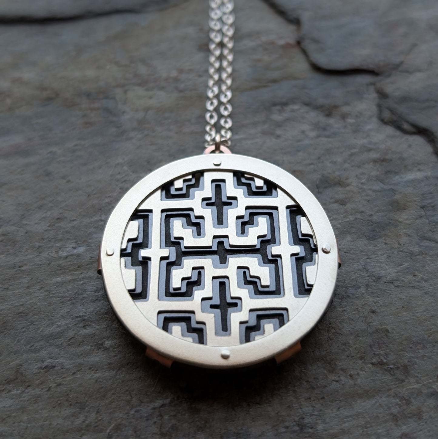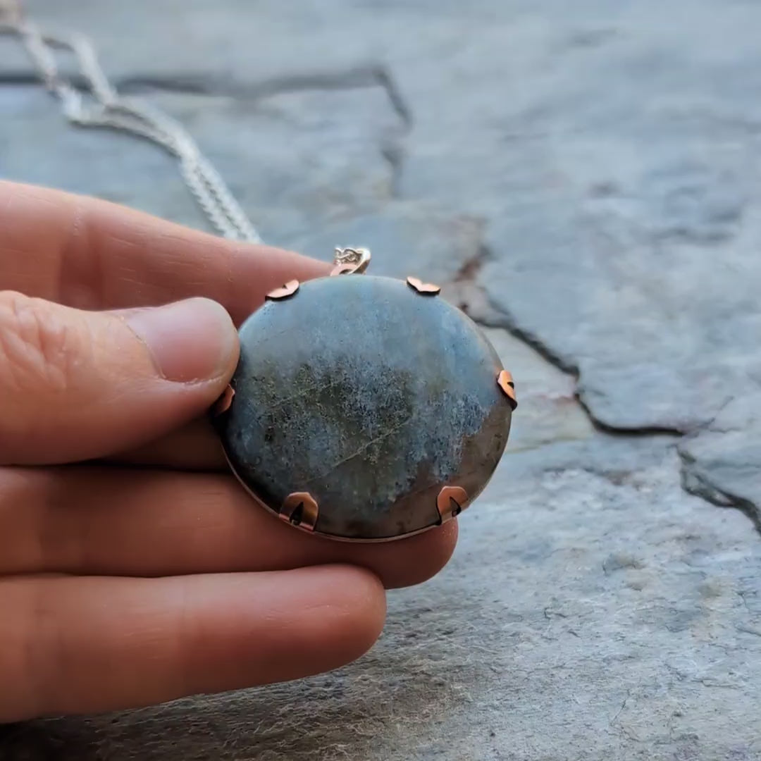- Material: handcut sterling silver, oxidised copper and Aotea cabochon