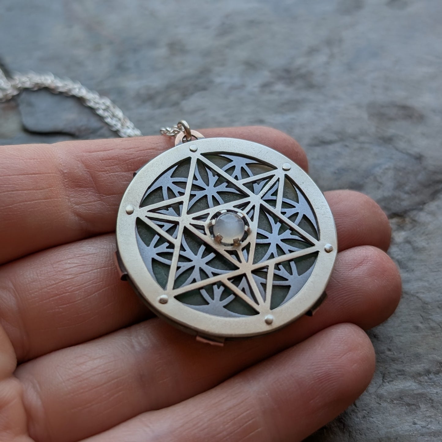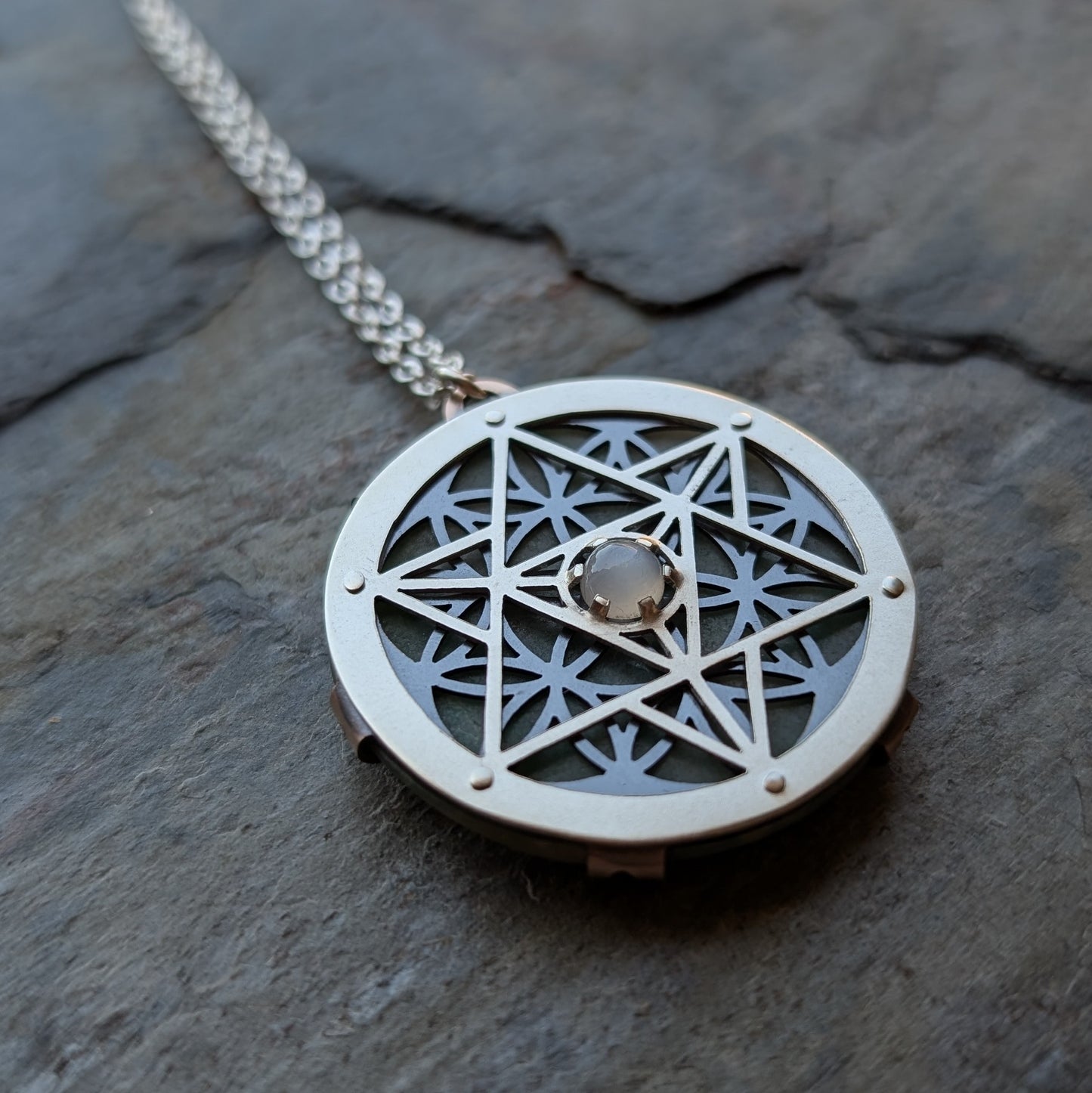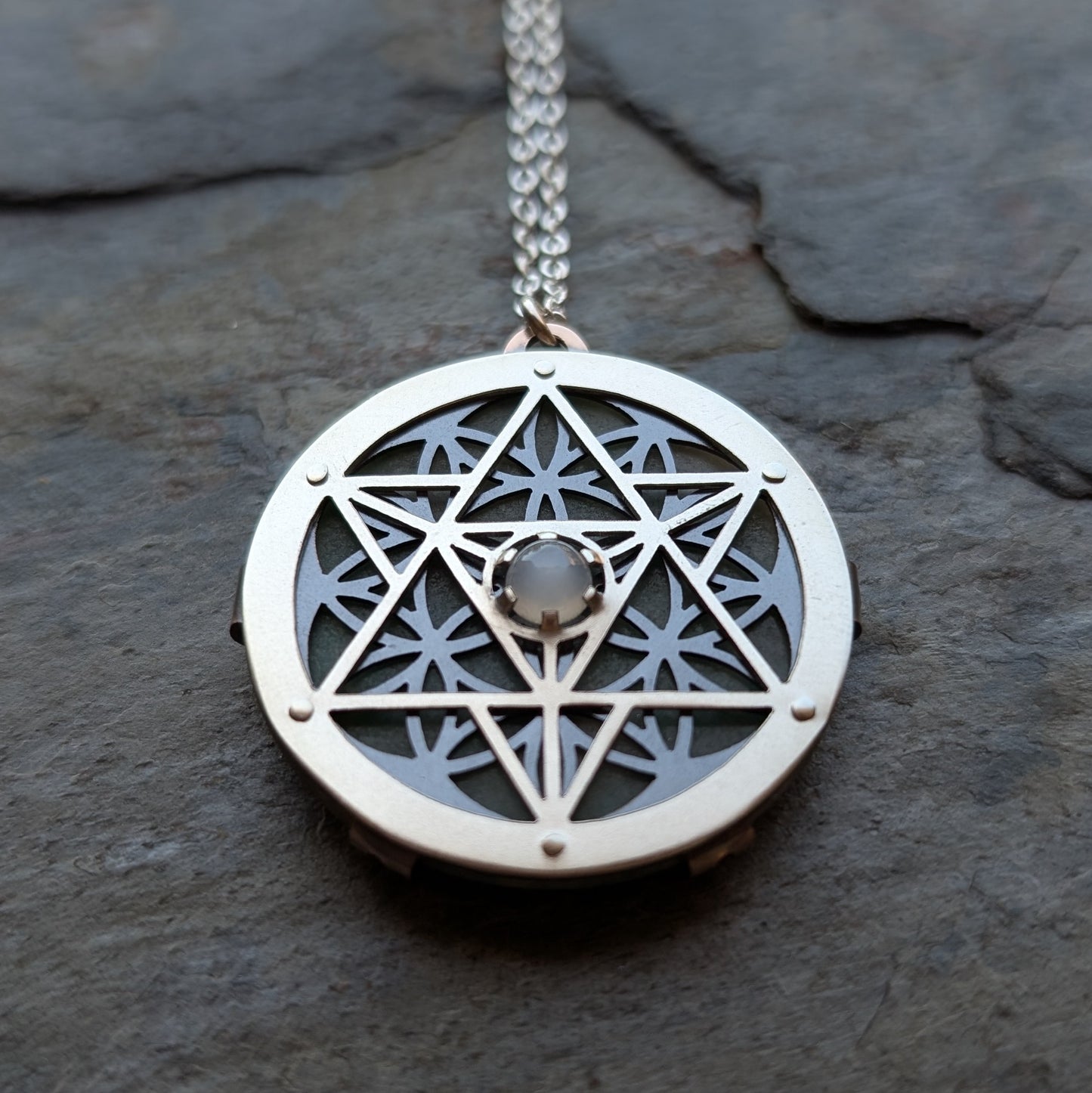 This pendant combines the Star Tetrahedron and the Flower of Life, symbols found in sacred geometry. The Star Tetrahedron (also known as the Merkaba) represents balance and unity, while the Flower of Life is a symbol of creation, mathematically reflecting the patterns of existence itself. Together, they form a visual expression of harmony, energy, and interconnectedness.