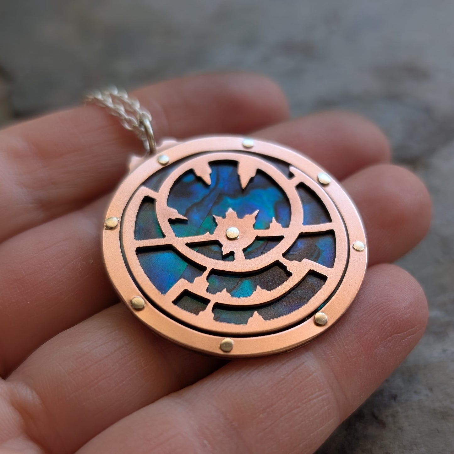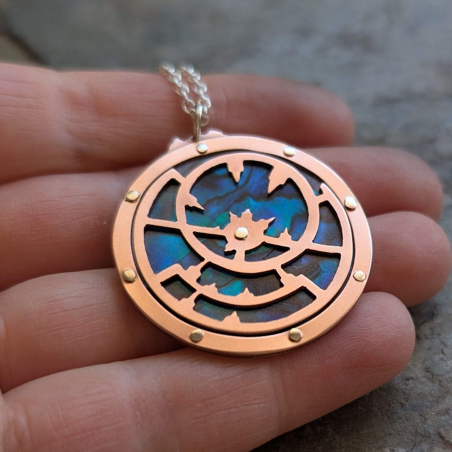 - Material: handcut copper and blue paua shell.