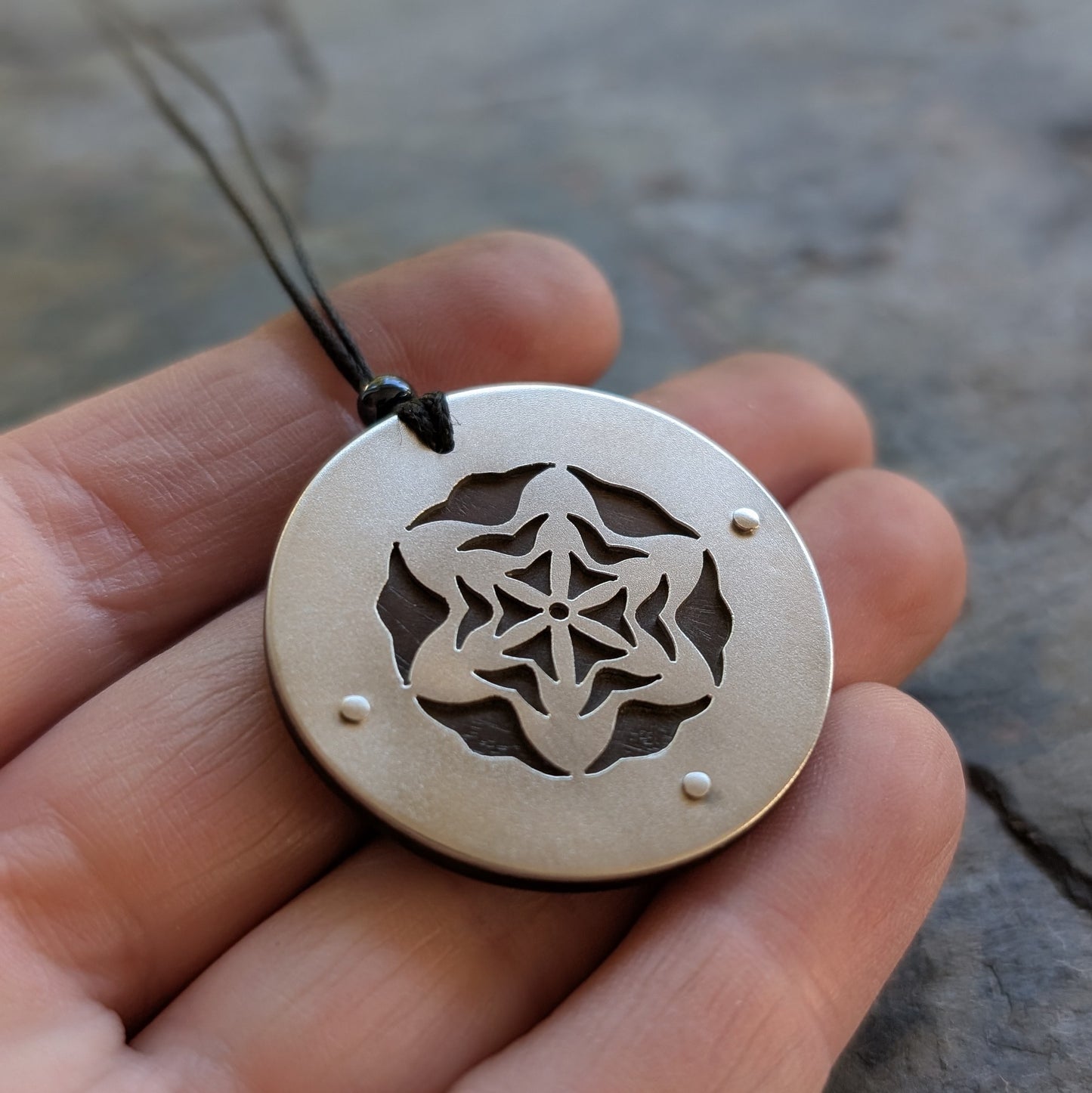 handcut sterling silver, lignum vitae wood backing.