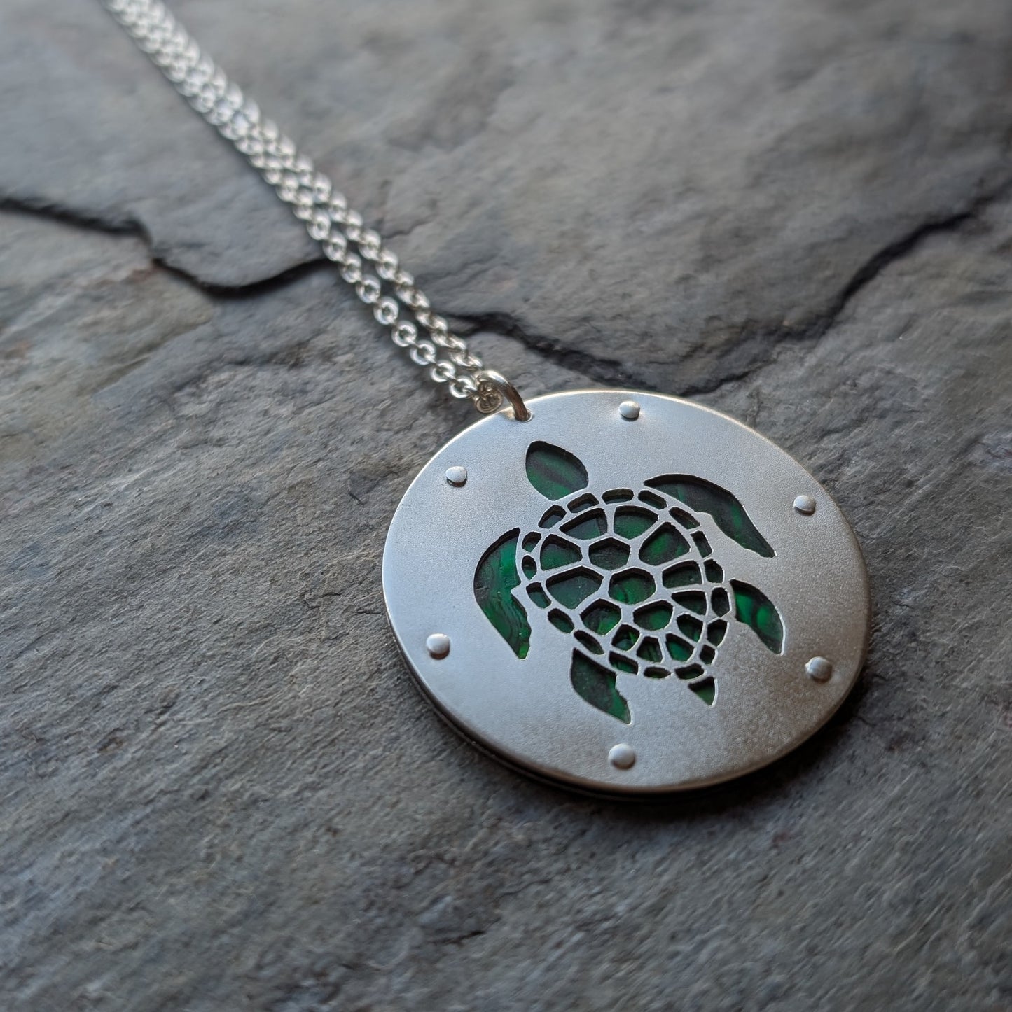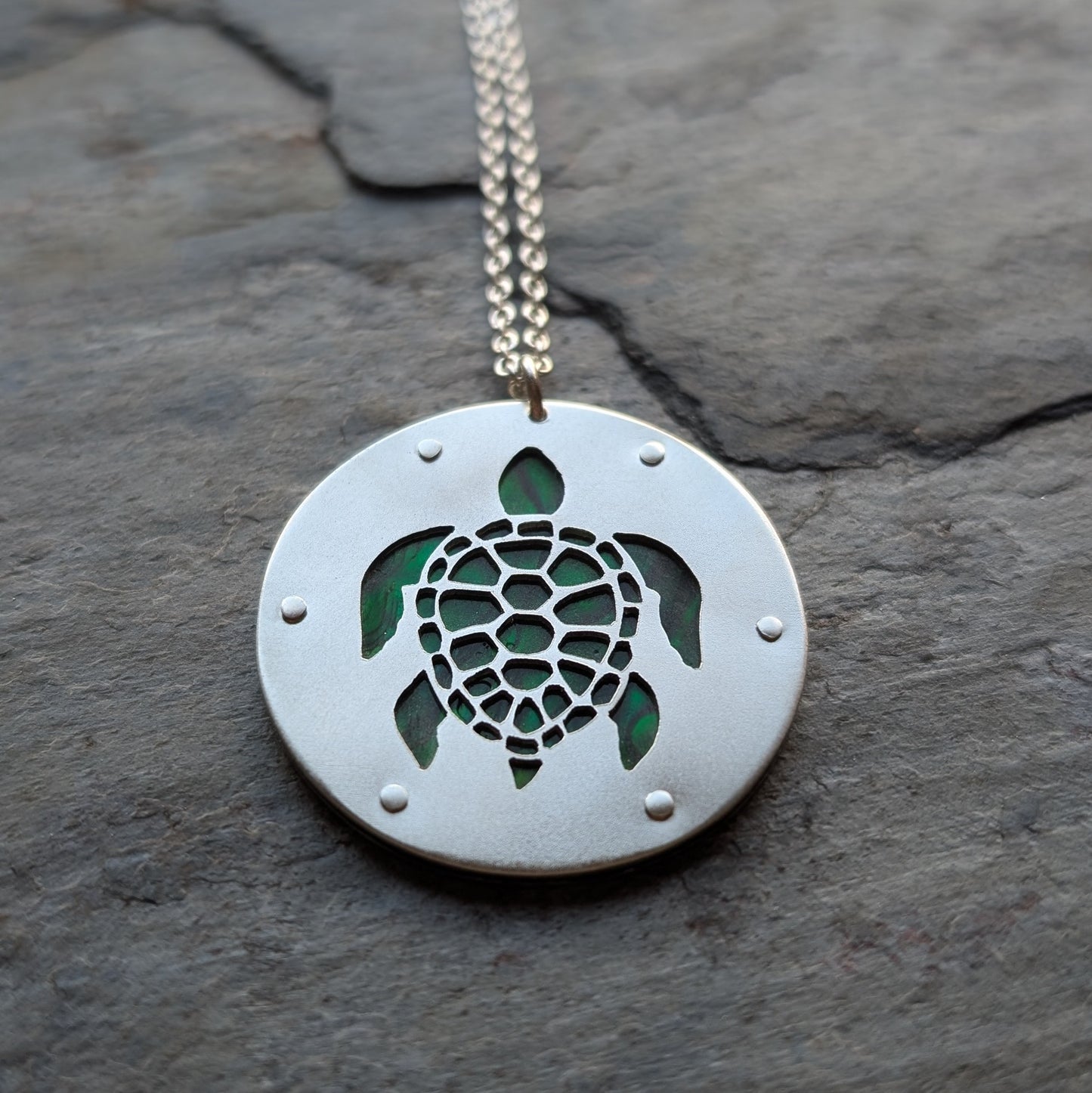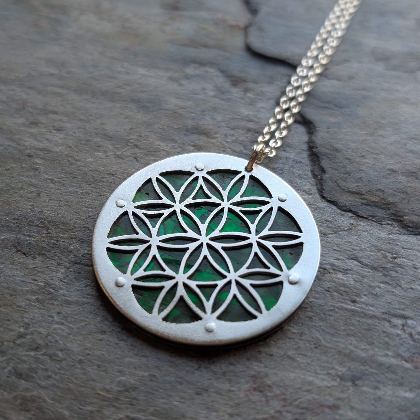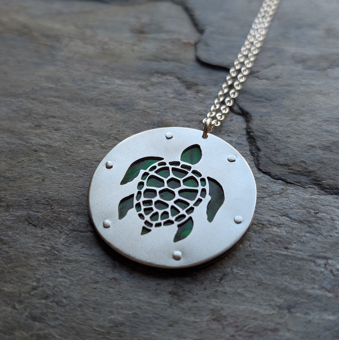 This pendant has a Flower of Life on one side and a Turtle design on the other side. It can be worn either way around.