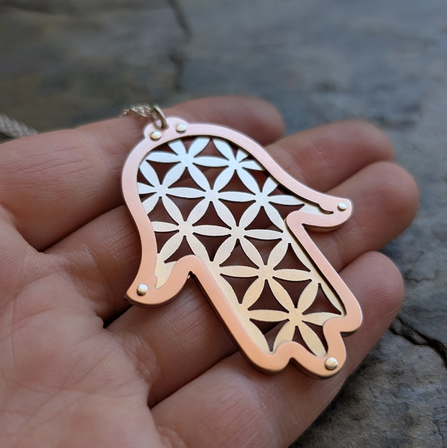 Regular price $210.00 AUDThe Hamsa hand is an ancient amulet design for protection. The Flower of Life is a symbol of creation, mathematically reflecting the patterns of existence itself. This design contains ancient, theological value depicting the fundamental forms of space and time, the ultimate representation of creation, harmony, and interconnectedness of all life.
