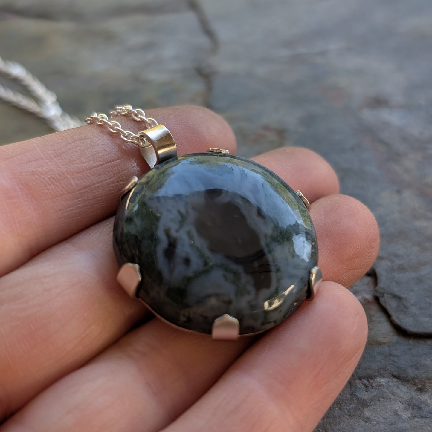 - Material: handcut sterling silver and moss agate.