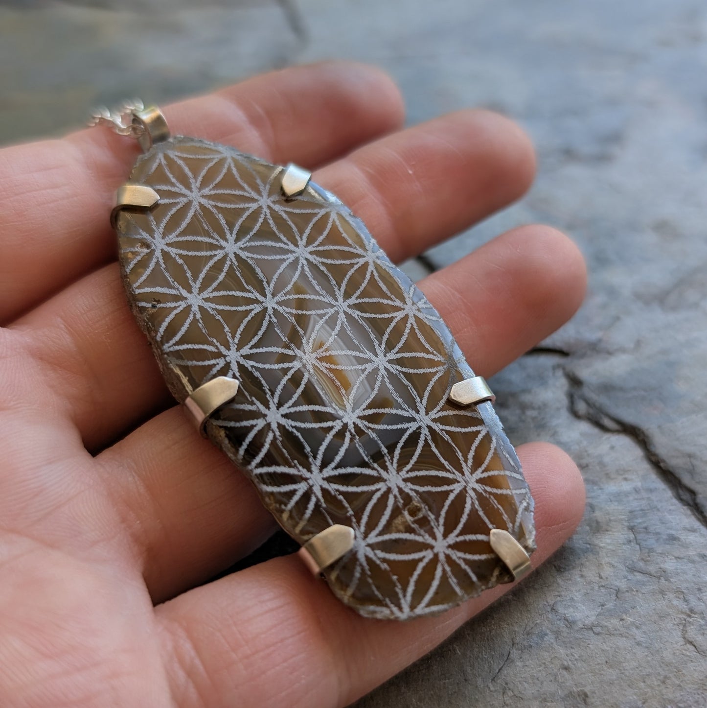 - Material: handcut sterling silver and etched labradorite.