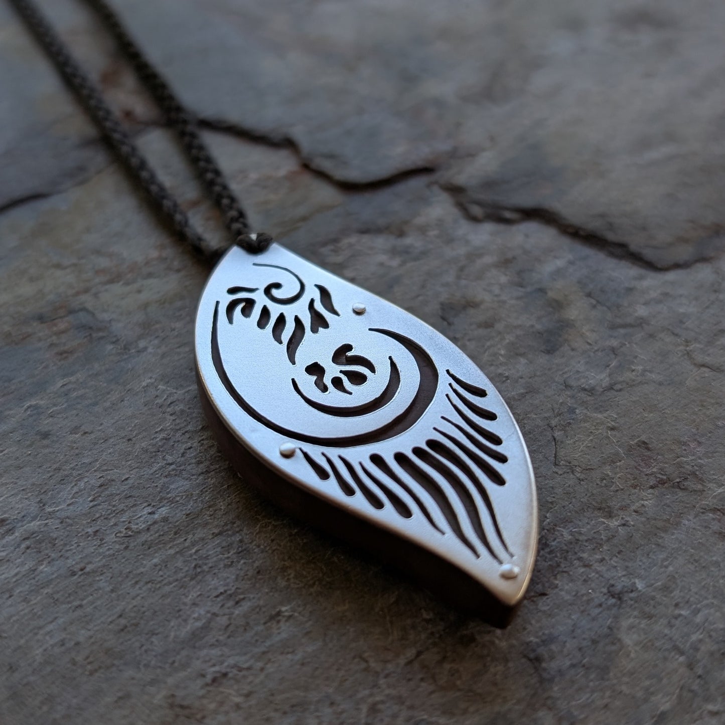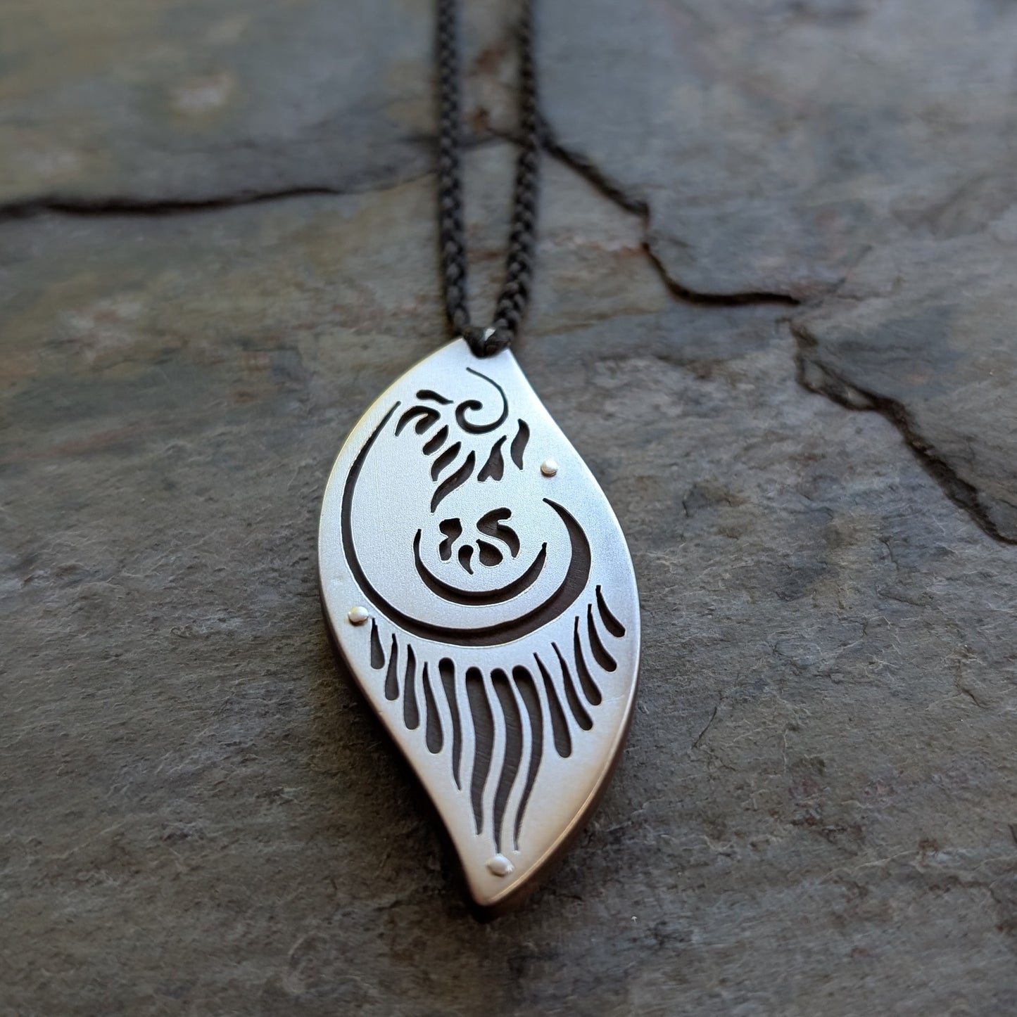 - Material: handcut silver, lignum vitae wood backing.