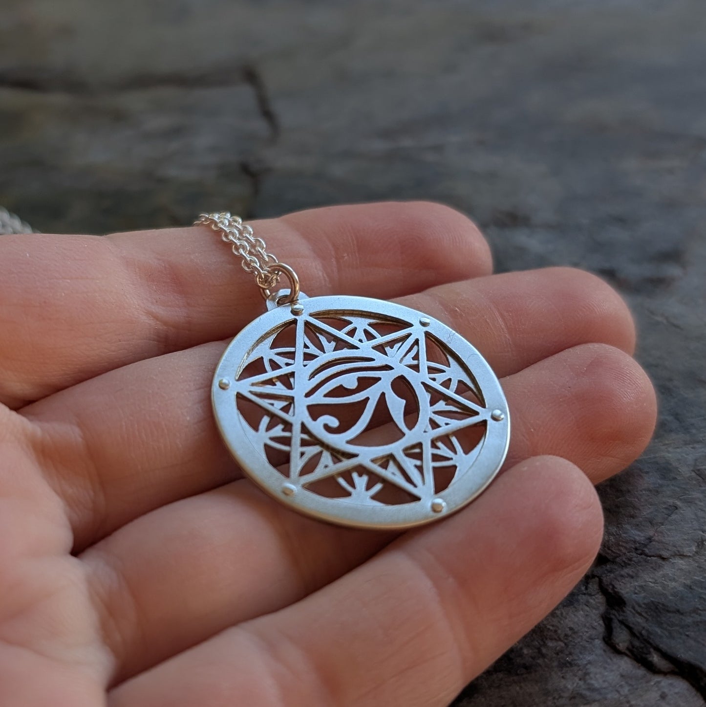 This pendant combines the Star Tetrahedron and the Flower of Life, symbols found in sacred geometry. The Star Tetrahedron (also known as the Merkaba) represents balance and unity, while the Flower of Life is a symbol of creation, mathematically reflecting the patterns of existence itself. Together, they form a visual expression of harmony, energy, and interconnectedness.