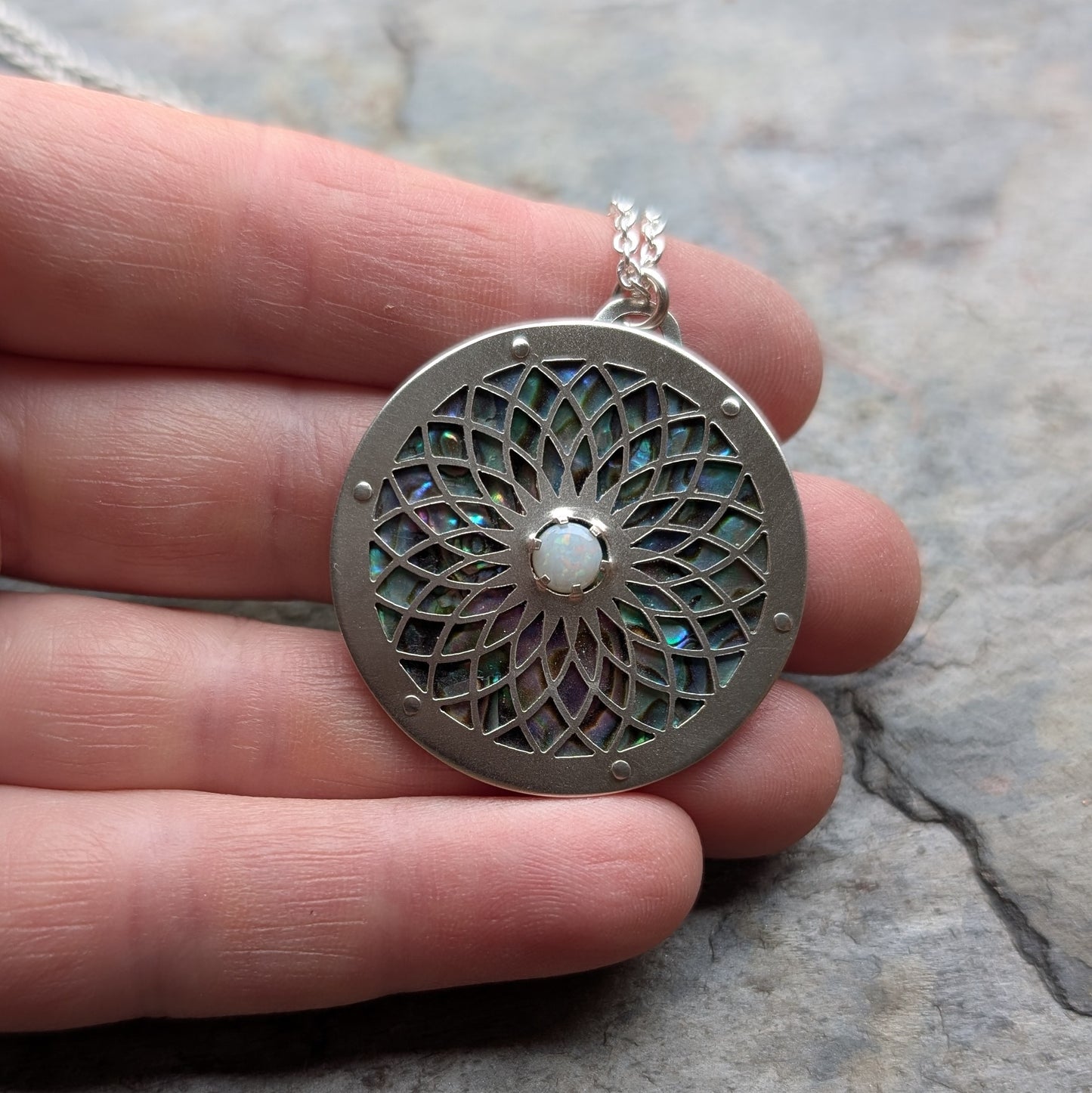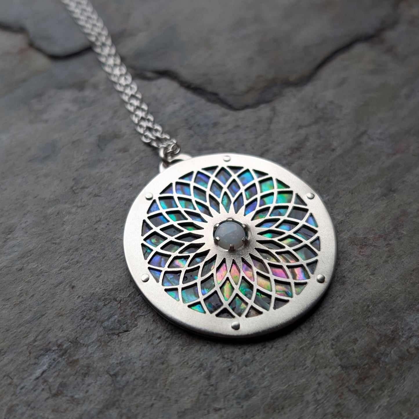 I handcut this layer of sterling silver to form a Toroid pattern, through which can be seen a layer of NZ paua shell. A beautiful Australian opal cabochon is set in the center, and a sterling silver backing is riveted in with sterling silver rivets.