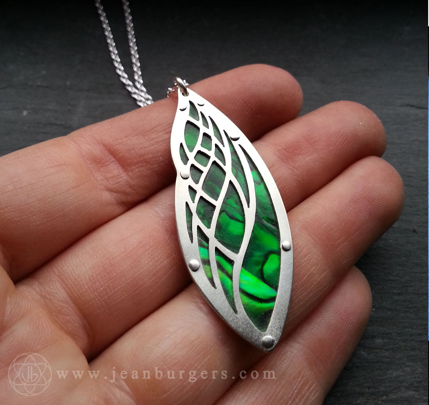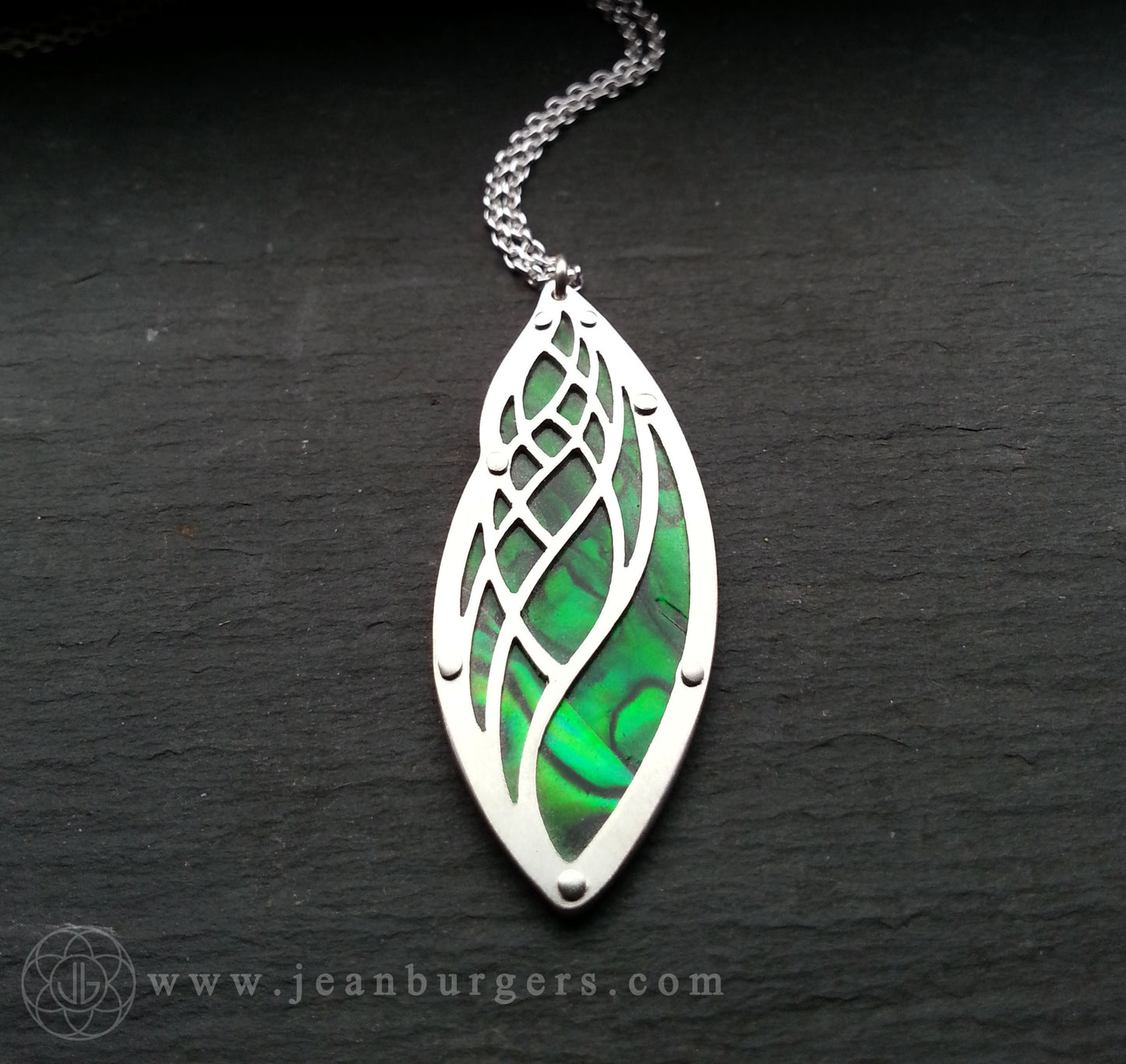 handcut sterling silver and green tinted paua shell.