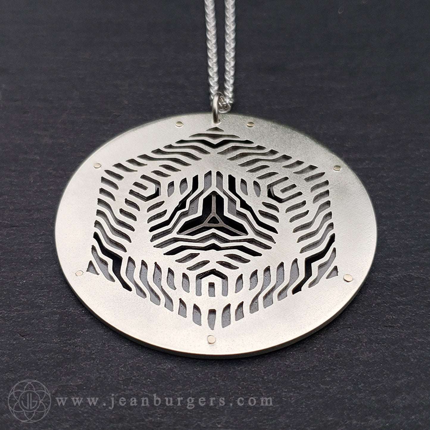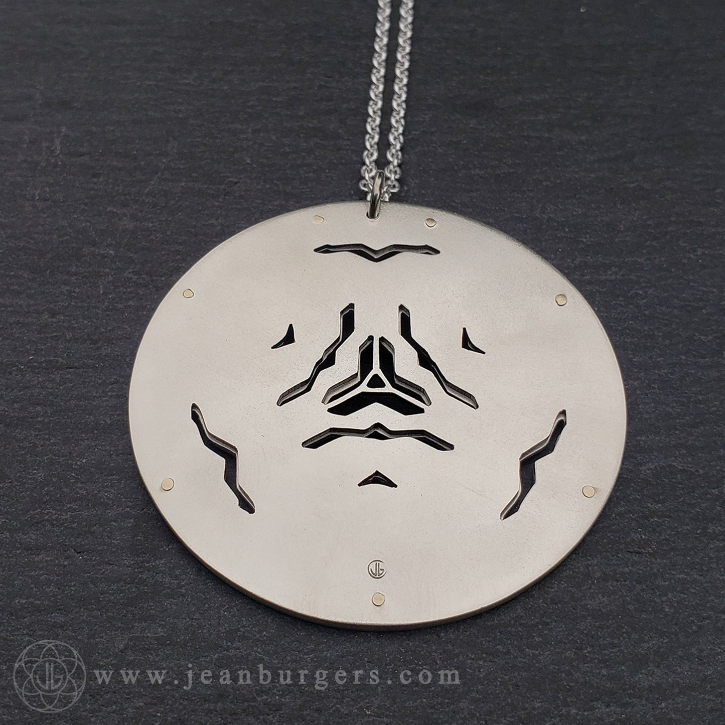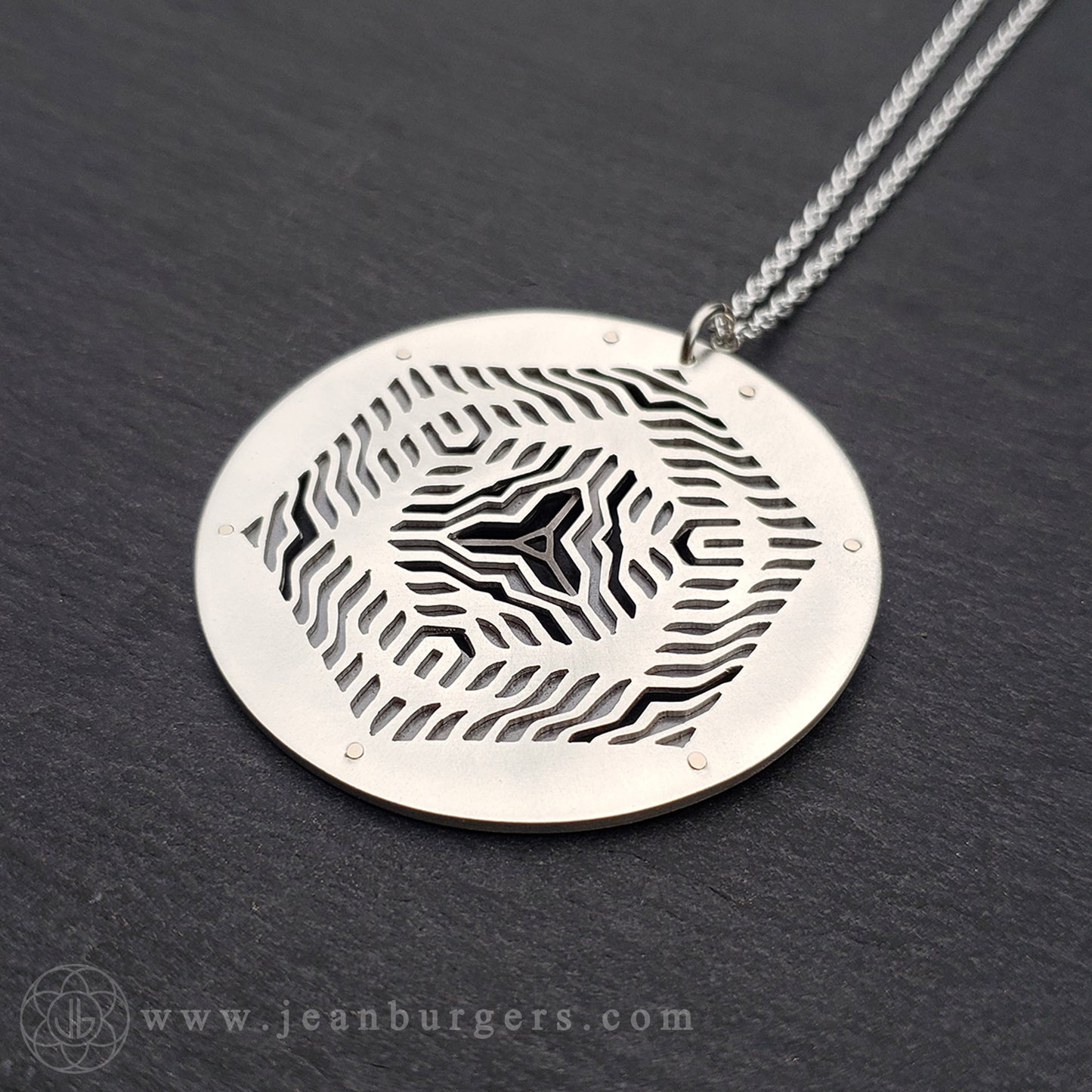 This piece is a one off handmade creation, using epic geometric designs by Tattoo Artist Cassady Bell, and brought to life using silver smithing techniques.