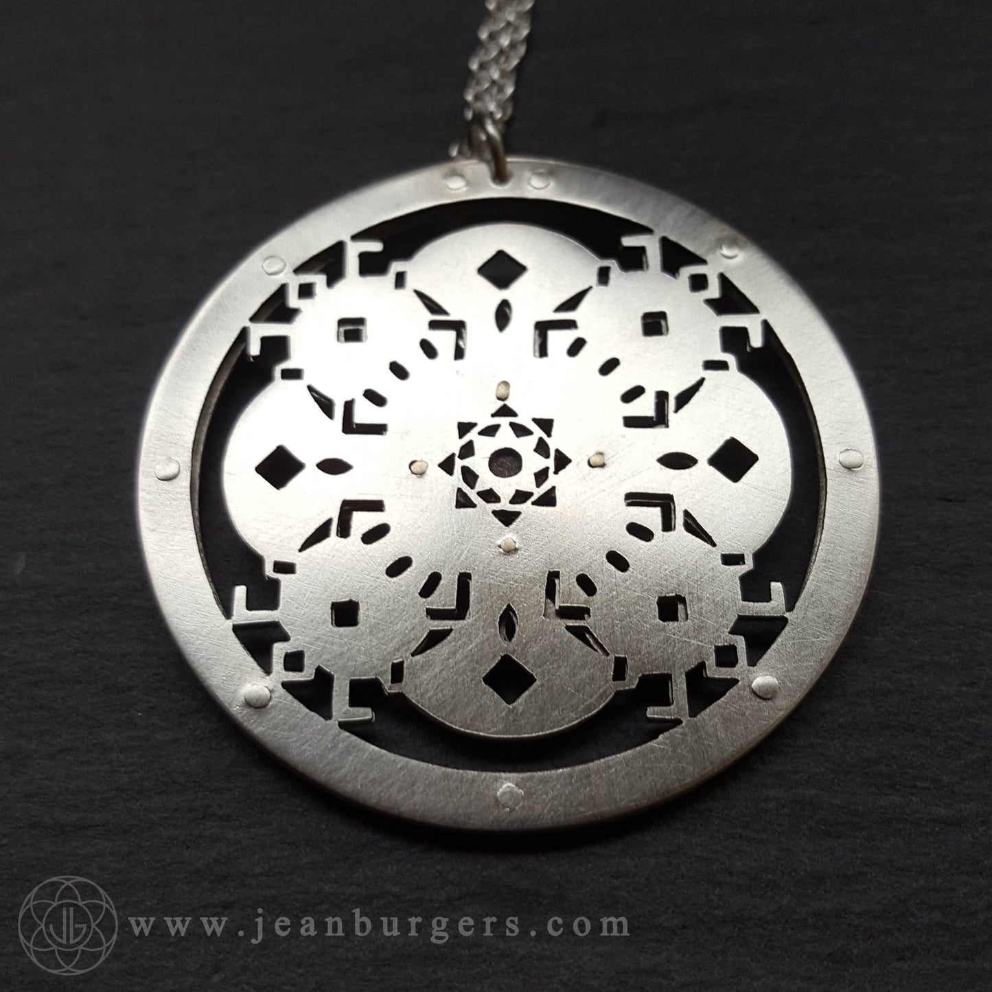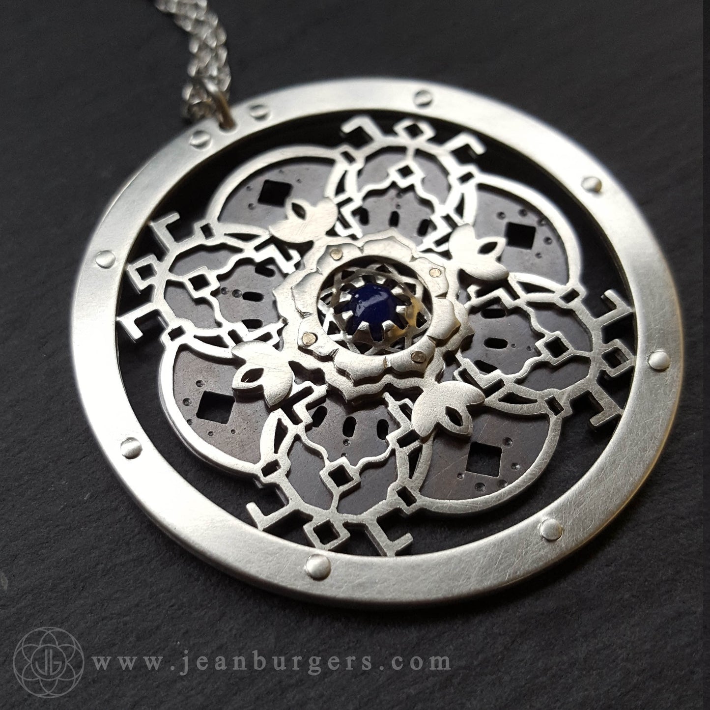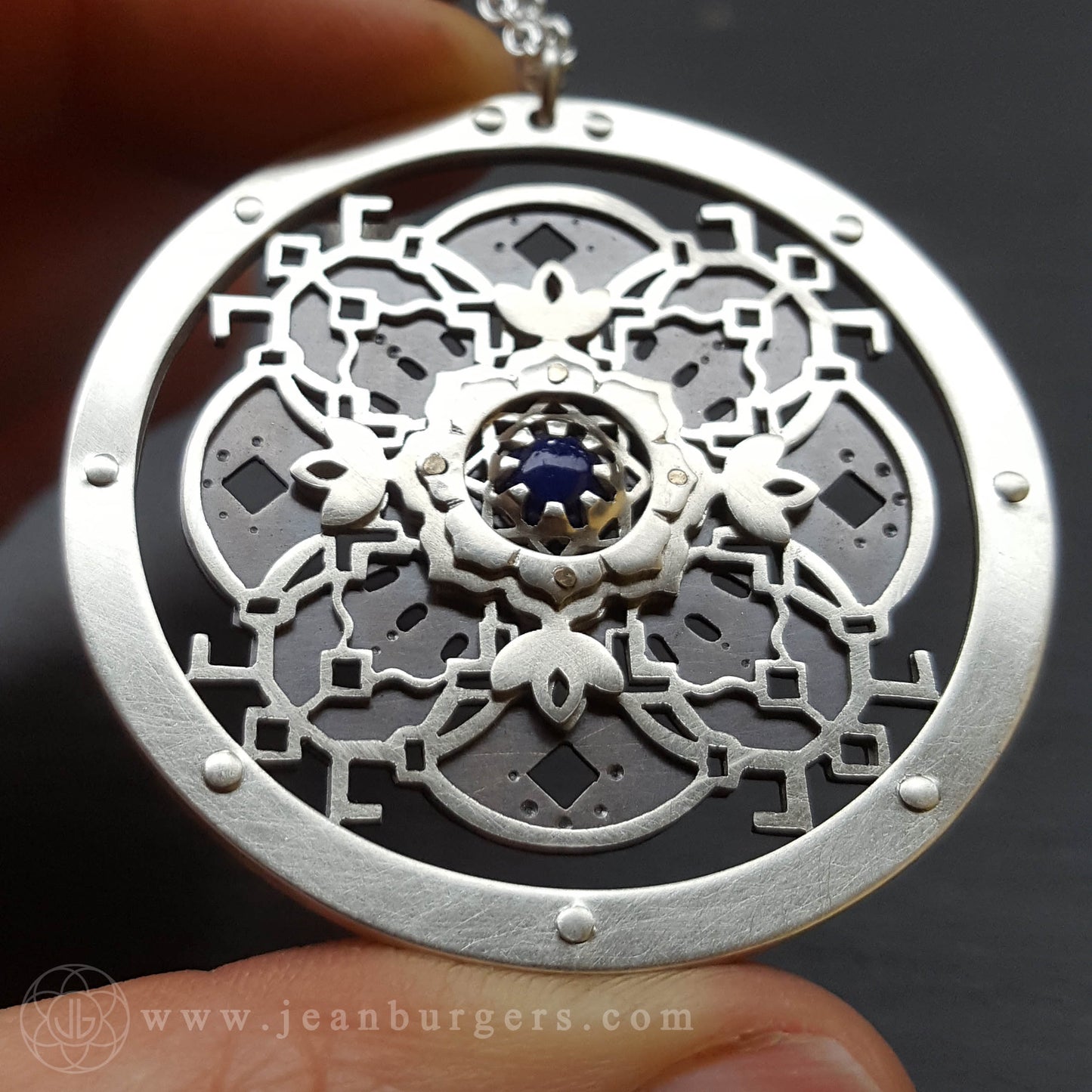 This pendant is one of a limited series of unique works created in collaboration with Hazel Mandala. He has given me his beautiful mandala design called Through The Water She Spoke. I handcut 5 layers of sterling silver to form this intricate pattern, riveted them together using sterling silver and 9ct gold rivets, and set a beautiful deep blue lapiz lazuli cabochon as the heart stone.