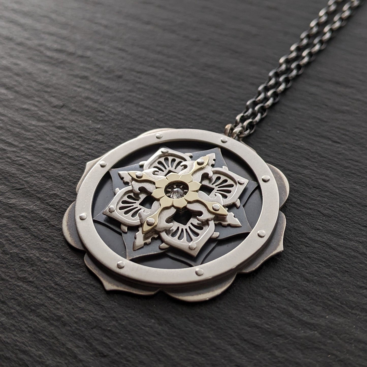 I handcut a layer of 14ct gold, and 5 layers of sterling silver, so that when put together, they form the Desert Flower design. I cut them by hand using a tiny sawblade, and riveted them together using handcrafted sterling silver rivets. In the centre I set a beautiful salt and pepper diamond.