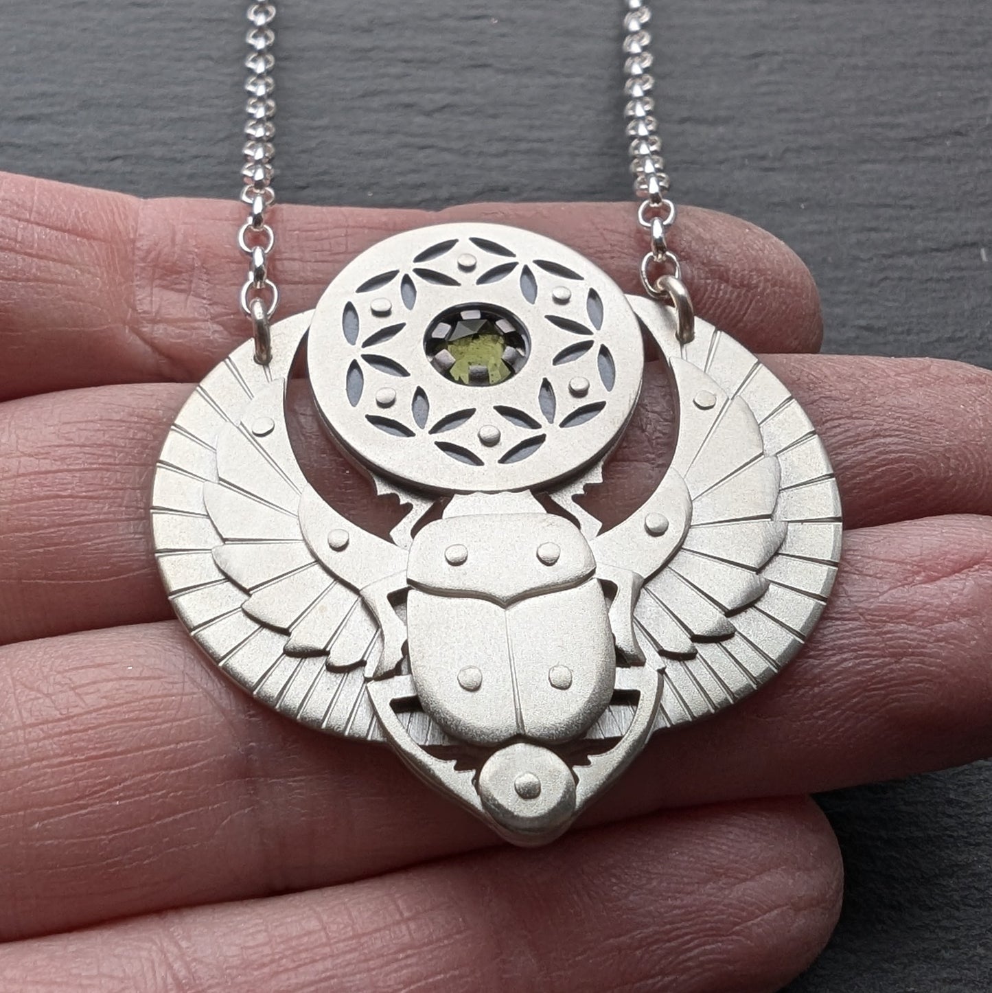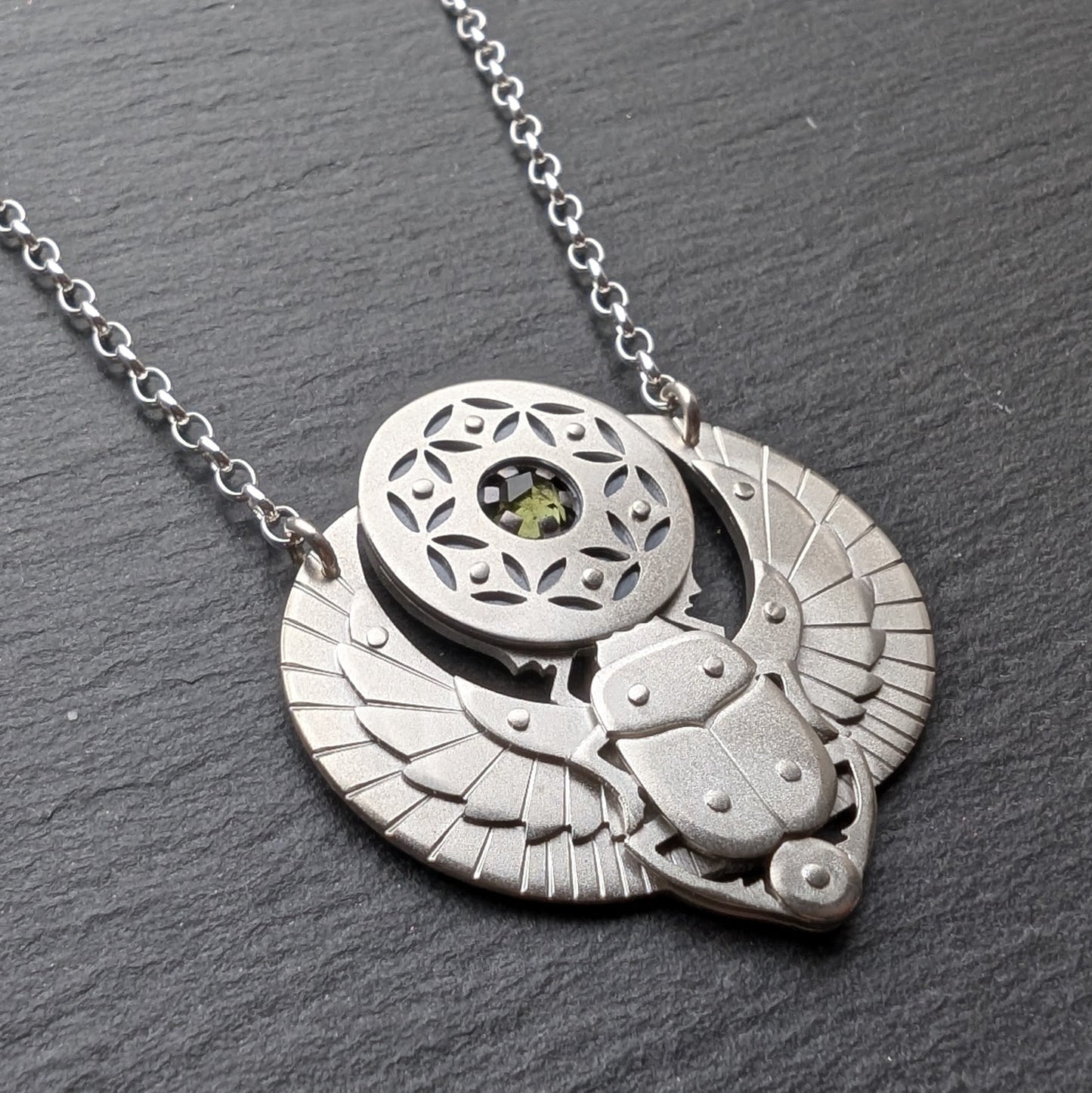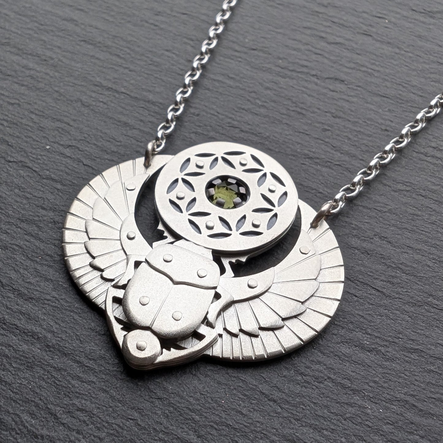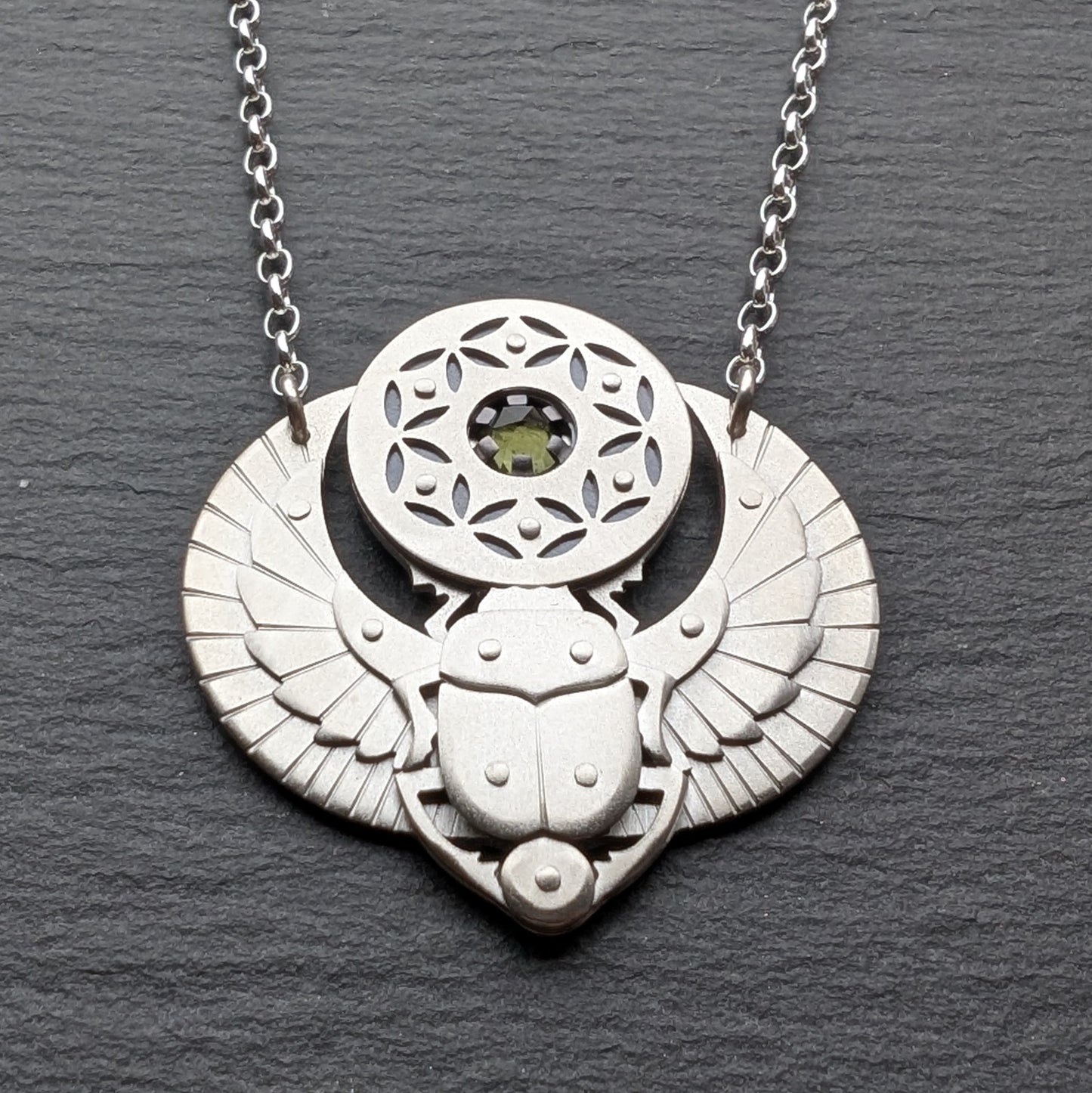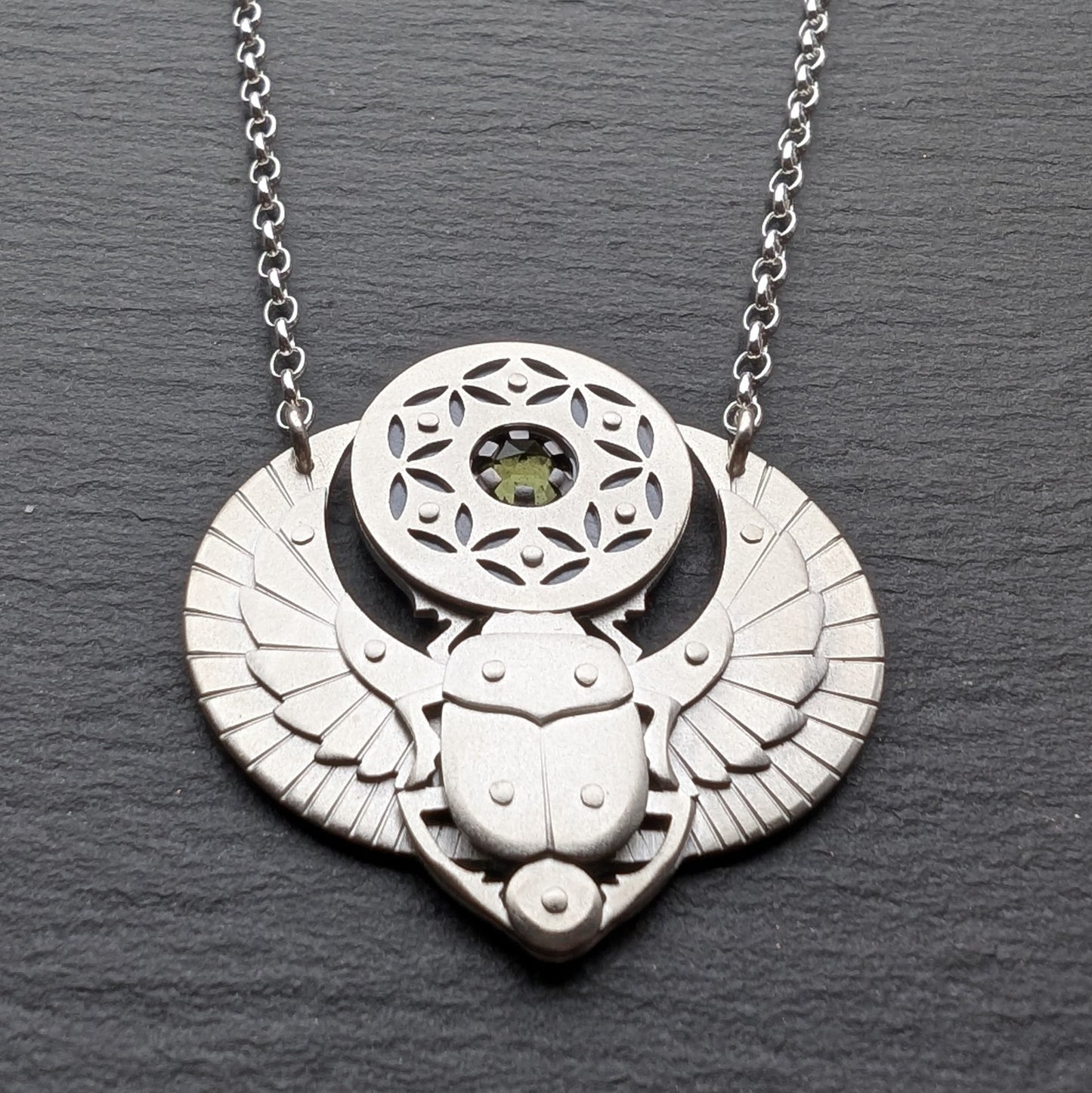Inspired by ancient Egyptian mythology, this Scarab pendant honors the scarab beetle as a symbol of creation and transformation. The scarab was closely linked to the sun-god Khepri, who was believed to roll the sun across the sky each day representing the eternal cycle of renewal.