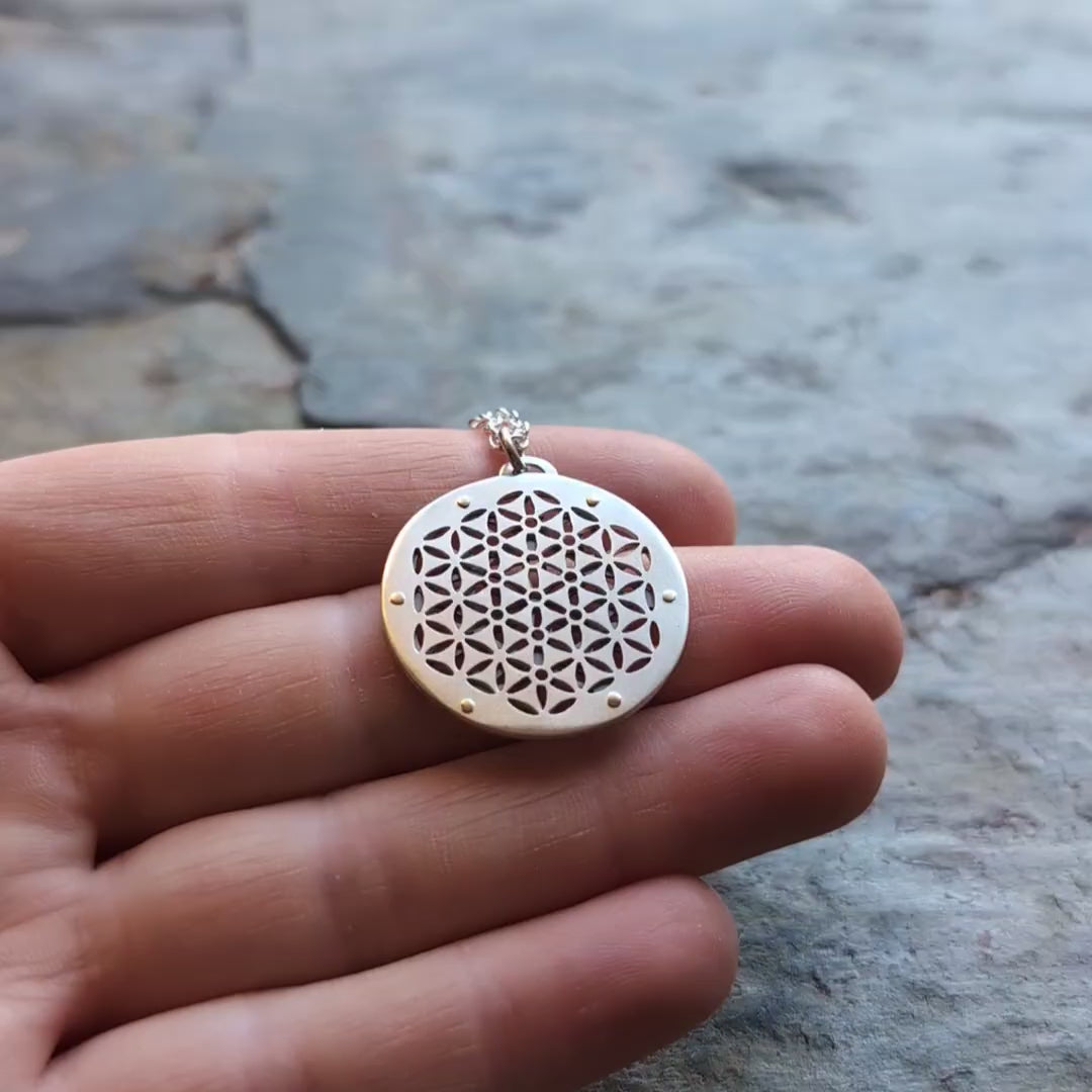This pendant combines the Flower of Life and the Kabbalah design, also known as the Qabala, Sephiroth and Tree of Life. The Flower of Life is a symbol of creation, mathematically reflecting the patterns of existence itself. This design contains ancient, theological value depicting the fundamental forms of space and time, the ultimate representation of creation, harmony, and interconnectedness of all life.