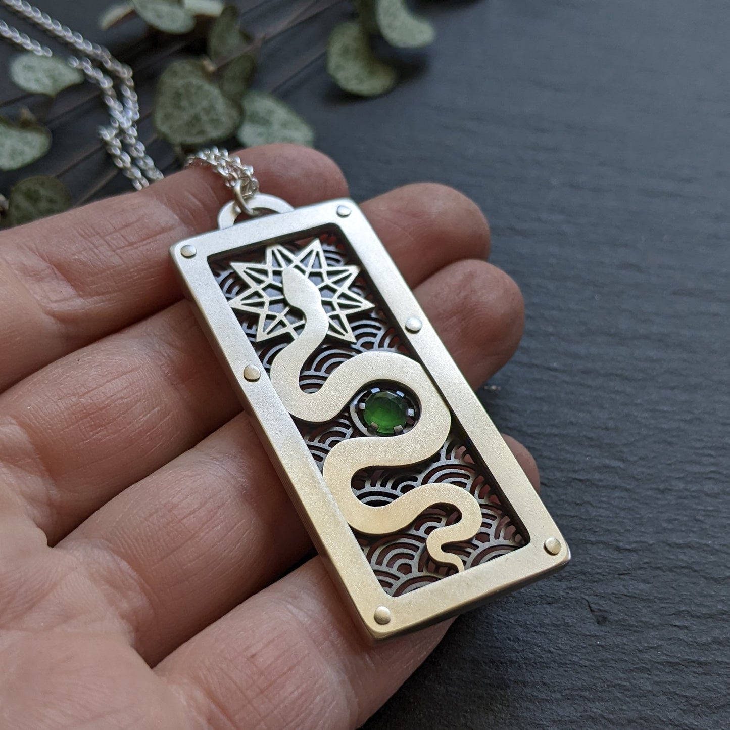 handcut sterling silver, oxidised silver and rosecut serpentine