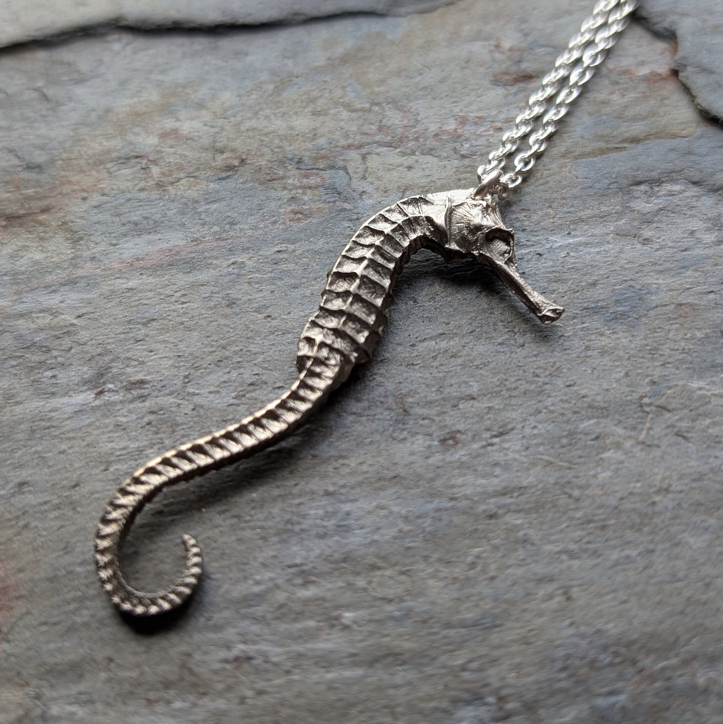 The seahorse is made from solid white bronze and has been hand polished to a shine on the raised surfaces, to bring out the fine details.